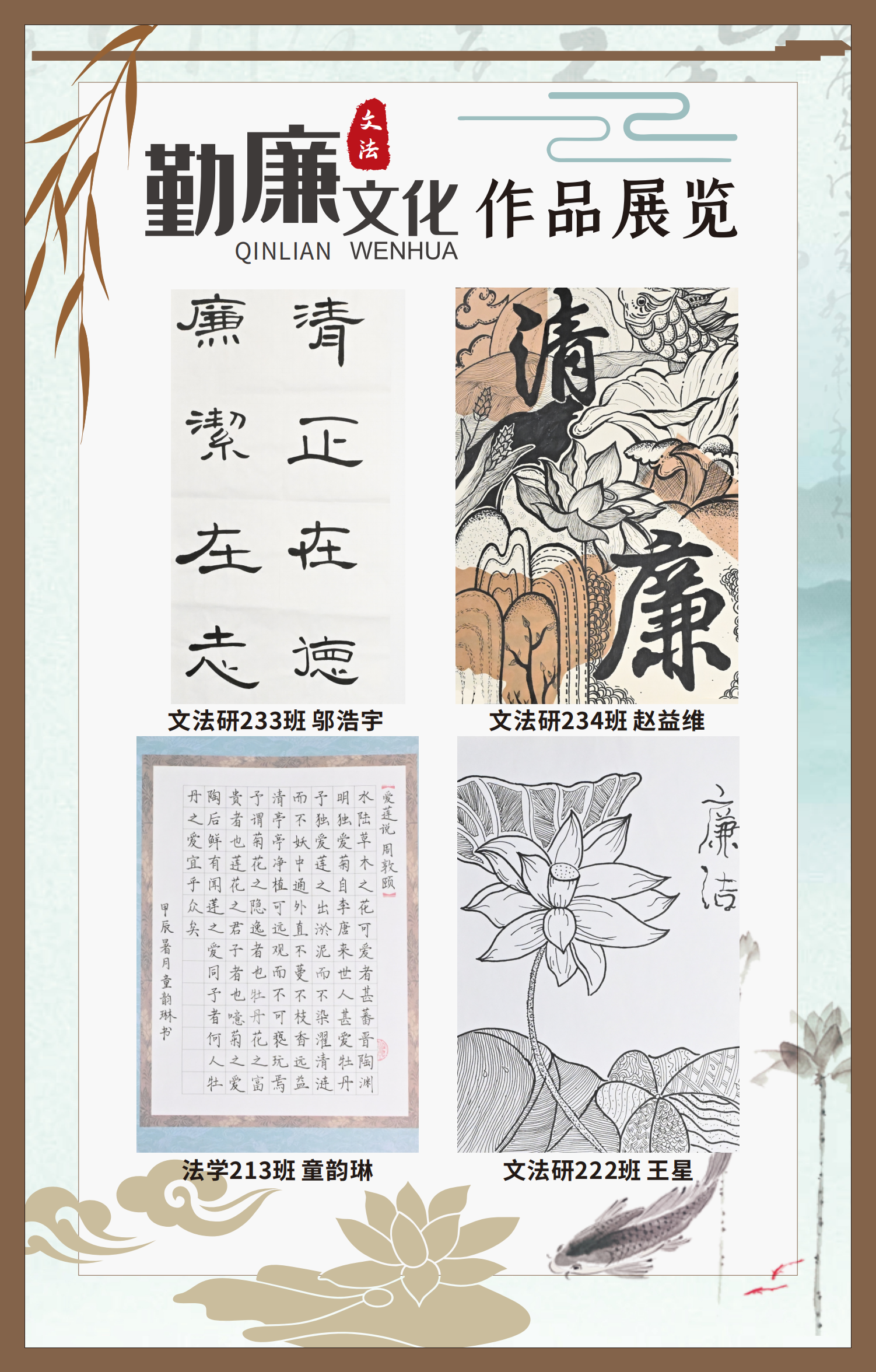 文法學(xué)院“步步生廉”文化走廊,植根于“六廉頌”清廉文化品牌,依托學(xué)院勤廉文化月活動,以師生清廉主題作品為媒介,系統(tǒng)呈現(xiàn)文法學(xué)院師生“知廉、守廉、促廉、倡廉”的實踐自覺,全景展現(xiàn)將新時代廉潔文化建設(shè)融入“立德樹人”根本任務(wù)的生動范例。