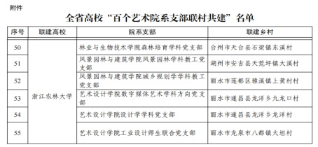 近日,浙江省委教育工委公布了全省高校“百個藝術院系支部聯村共建”名單,我校林生院森林培育學科黨支部,園林學院風景園林學科教工黨支部、城鄉規劃學學科教工黨支部,藝術學院數字媒體藝術學科方向黨支部、設計學學科黨支部、工業設計師生聯合黨支部的黨建聯建項目成功入選。
