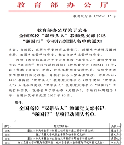近日,教育部辦公廳公布1486個全國高校“雙帶頭人”教師黨支部書記“強國行”專項行動團隊名單。我校化學與材料工程學院林業工程學科黨支部,現代農學院作物學科黨支部,林業與生物技術學院森林培育學科黨支部,環境與資源學院、碳中和學院農業資源與環境學科黨支部等4個黨支部入選。