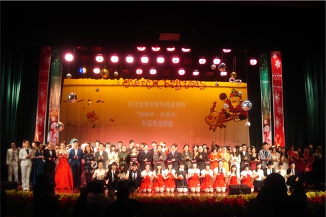 浙農林大新聞網訊 迎新年,慶圣誕。12月23日,外國語學院在活動中心影劇院舉辦2012年外語專業晚會。校黨委副書記方偉,副校長張立欽,校黨委委員、工會主席汪士華,校黨委委員、科技處處長陳永富出席晚會。學校各職能部門負責人、各二級學院領導以及全校師生1200余人觀看晚會。校領導、外國語學院領導班子與師生同臺載歌載舞,掀起晚會陣陣熱潮。