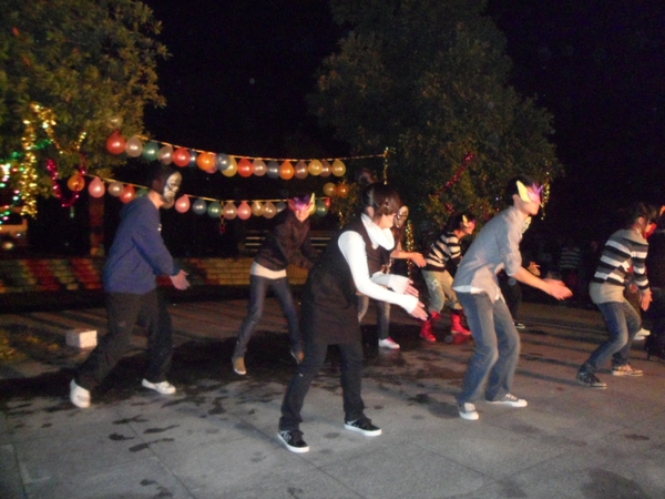 11月1日萬圣節,大學生英語協會舉辦的化妝舞會則在B區操場邊香樟樹下熱鬧開場。在動感音樂《shall we dance》中,火辣的雙人拉丁贏來臺下掌聲陣陣。緊接著,兩位主持人用流利的英語宣布晚會開始。天氣雖冷,但壓不住同學們高漲的熱情。一首悠揚婉轉的《不再回頭》令同學們沉醉其中,一段鏗鏘有力雙節棍表演令同學們拍手叫絕,一曲《the saltwater room》讓我們融入了美妙的英文世界,同學們不由自主的輕聲跟唱起來。到了游戲環節,同學們踴躍報名參與,充分融入其中,臺上臺下嬉笑聲連連,成了一片歡笑的海洋。隨后,英協干事們頭戴化妝舞會面具跳起《sorry sorry》舞,引起臺下陣陣驚叫,整場晚會走向高潮。最后,伴隨著《right right left left》歡快的節奏,晚會在充滿活力的兔子舞中結束了。