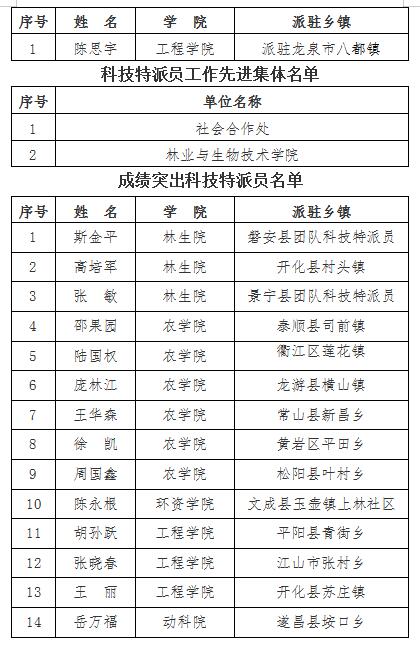 我校自科技特派員制度實施以來,15年期間先后向全省25個縣(區)94個欠發達鄉鎮派駐了502人次的省級個人科技特派員、18個團隊科技特派員、1個法人科技派員和18個市級個人科技特派員,累計開展農村新型實用技術培訓1390余期,培訓農民5.5萬余人次,探索形成了個人特派員結對項目、團隊特派員服務產業、法人特派員支撐全縣的完整的科技特派員體系,為解決我省“三農”問題發揮了重要作用。我校科技特派員們用自己的汗水、知識和一心向農的奉獻精神,率先在全省乃至全國創造了“一根科技竹、一畝萬元山、一群特派員”的“浙農林模式”。