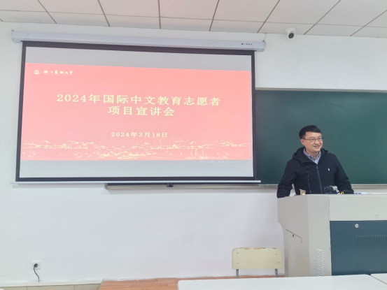 3月18日,國教學院在學3-517舉辦2024年國際中文教育志愿者項目宣講會,浙江省孔子學院師資選拔培訓中心辦公室主任包亮、志愿者項目主管葉胤俊應邀出席,校茶文化、漢語言文學、英語、廣告學等專業40余名學生報名參加。