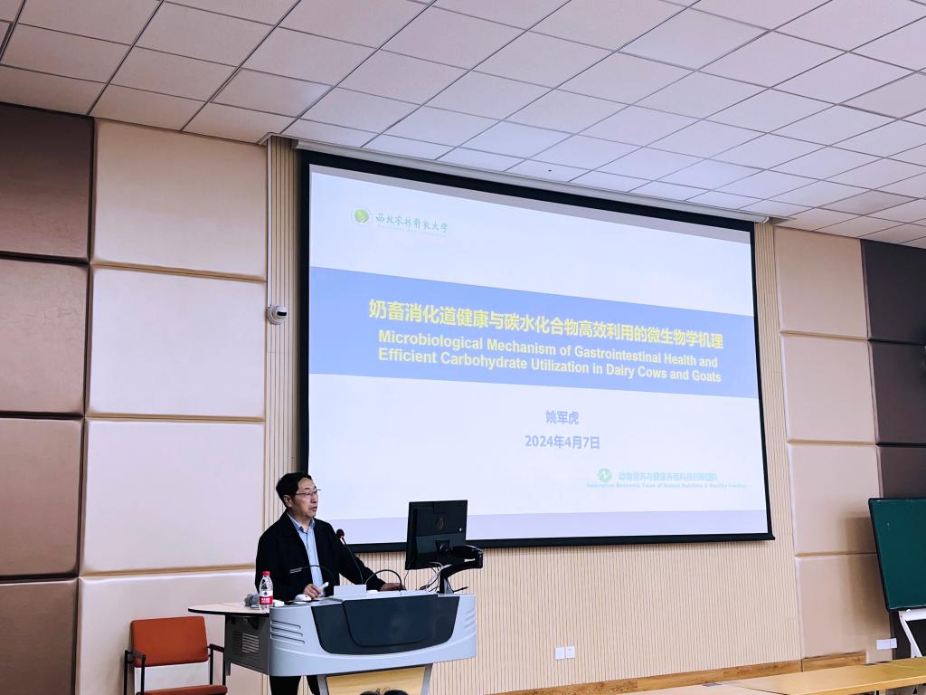 4月7日上午,中國動物營養學分會副理事長、中國動物營養指導委員會委員、西北農林科技大學二級教授姚軍虎應邀為動科動醫學院師生作題為“奶畜消化道健康與碳水化合物高效利用的微生物學機理”的學術報告。學院學科相關負責人及師生代表等100余人參加會議。