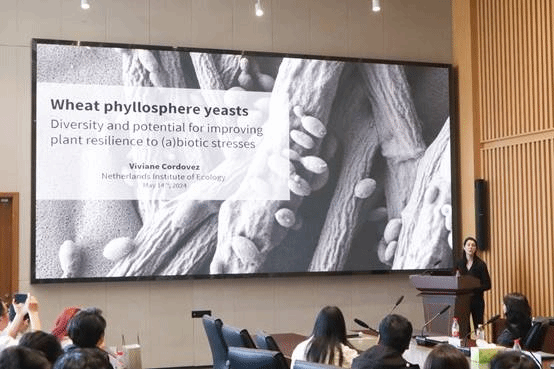 Eiko教授介紹了其科研團(tuán)隊(duì)概括,并就氣候變化等影響下的微生物群落的轉(zhuǎn)變分享了她團(tuán)隊(duì)的最新研究成果;Viviane教授作了題為“小麥葉際酵母的多樣性和提高植物對(duì)(非)生物脅迫的適應(yīng)能力的潛力(Wheat phyllosphere yeasts-Diversity and potential for improving plant resilience to (a)biotic stresses)”的精彩講座,報(bào)告圍繞小麥葉際酵母菌的分離鑒定及其對(duì)不同脅迫的響應(yīng)展開(kāi),詳細(xì)闡釋了葉際酵母菌對(duì)水稻在抗脅迫方面的影響;Ohana博士后作了題為“土壤中芽胞桿菌胞外多糖同化過(guò)程中活性細(xì)菌和真菌相互作用的動(dòng)態(tài)(Dynamics of active bacterial and fungal interactions in the assimilation ofacidobacterial EPS in soil)”的精彩報(bào)告,講座圍繞微生物胞外多糖積累、生物膜形成和土壤團(tuán)聚體結(jié)構(gòu)展開(kāi),詳細(xì)分享了利用多組學(xué)技術(shù)手段對(duì)真菌與細(xì)菌互作的研究。與會(huì)師生圍繞報(bào)告內(nèi)容與報(bào)告人開(kāi)展了深入的交流探討。
