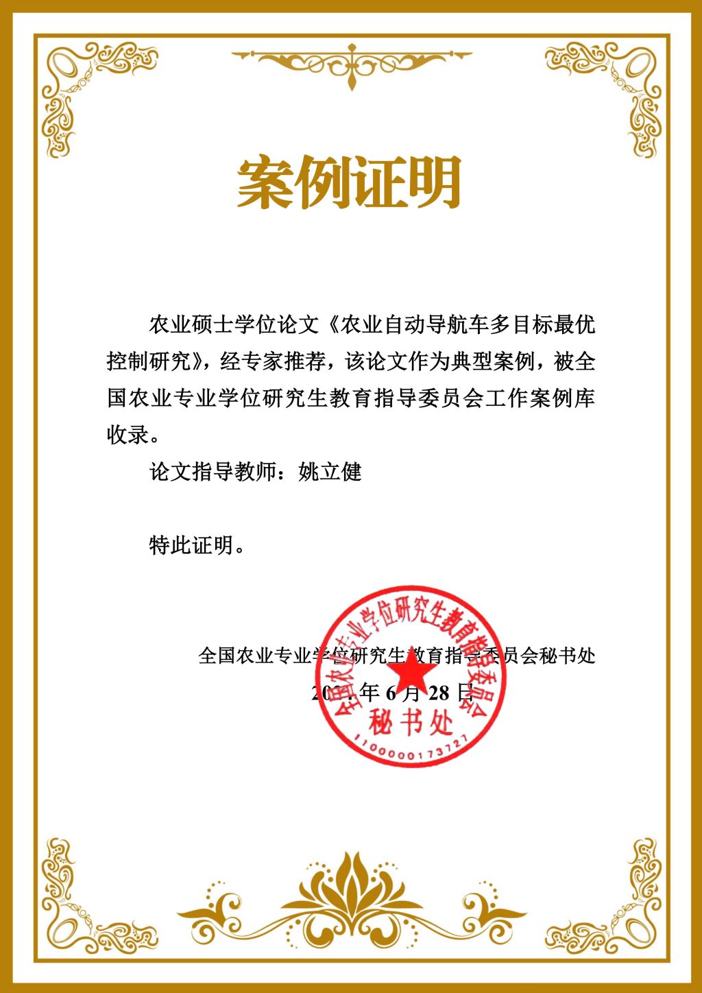 經個人申報、學校推薦和全國農業教指委評審,我校光機電學院姚立健教授指導的農業碩士農業工程與信息技術領域方案設計類學位論文《農業自動導航車多目標最優控制研究》入選全國農業碩士典型學位論文案例,該案例被全國農業專業學位研究生教育指導委員會工作案例庫收錄。