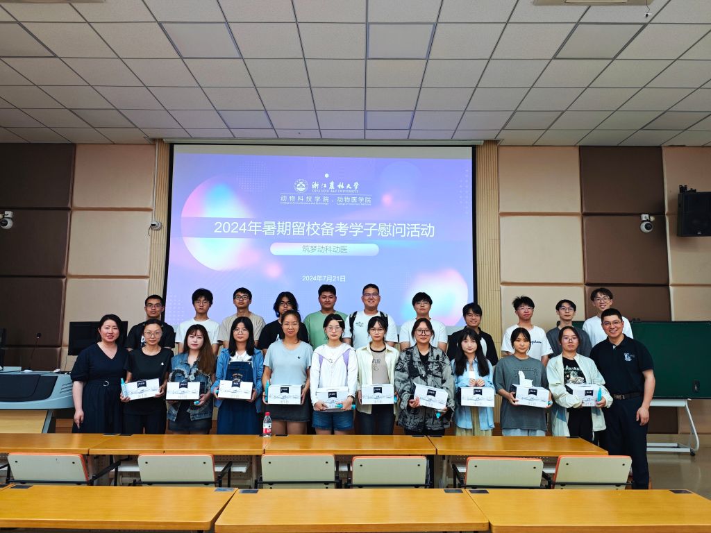 7月21日下午,動科動醫學院開展暑期留校備考學子慰問活動。校黨委委員、學院院長宋厚輝,學院黨委書記魏玲玲,學生工作負責人及輔導員參加活動,為備考學子們送去夏日清涼與學院關懷。