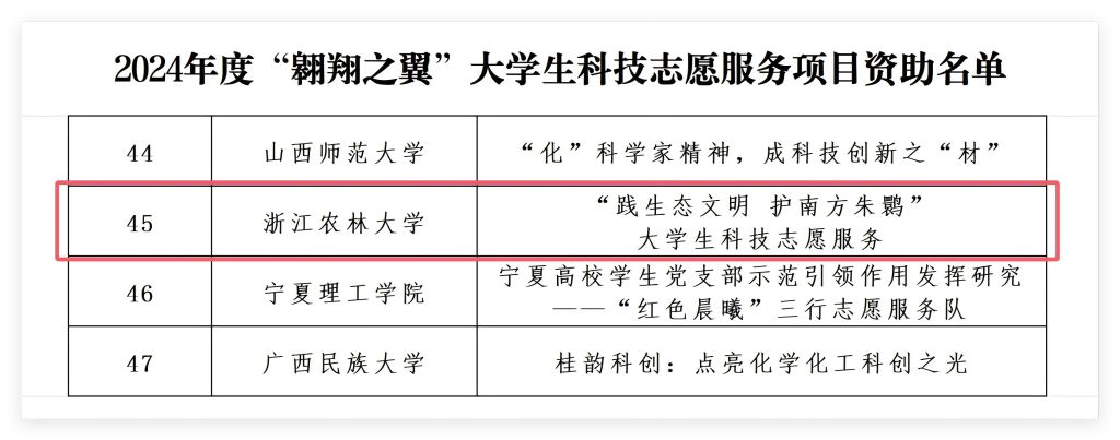 近日,中國科協公布2024年度“翱翔之翼”大學生科技志愿服務項目資助名單,我校動科動醫學院申報的“踐生態文明 護南方朱鹮”大學生科技志愿服務項目成功入選。?