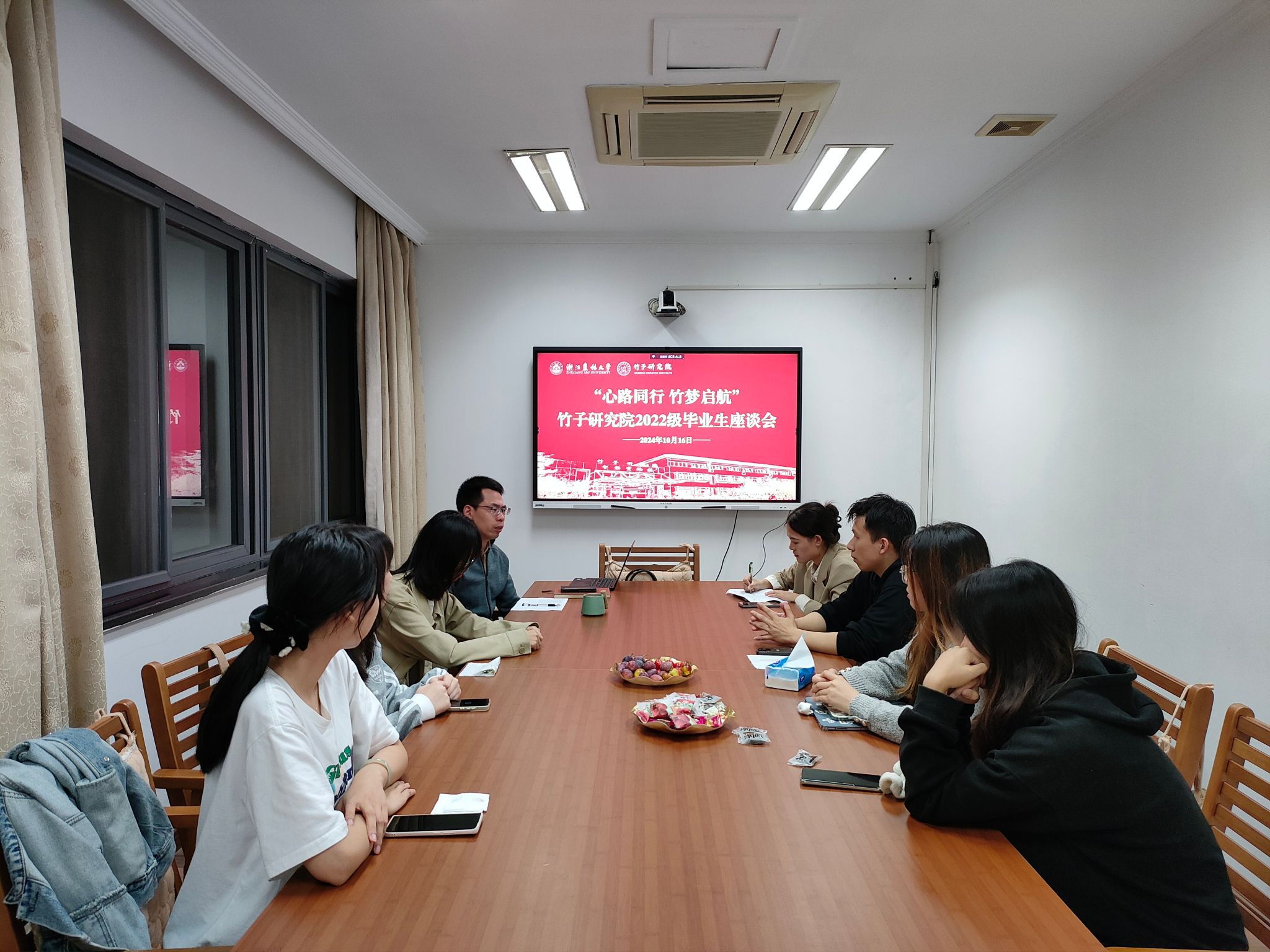 近日,竹研院于智能實驗樓S217召開“心路同行,竹夢啟航”2022級畢業生座談會。竹研院黨總支書記周能壽、輔導員以及各創新團隊畢業生參加座談。