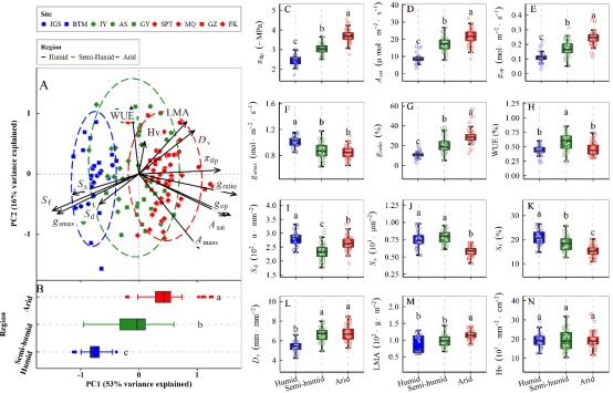 (2)氣孔密度和氣孔大小在半干旱/半濕潤區達到生理閾值(Figs2I, J and 3B, C),意味著氣孔密度和氣孔大小的調控不足以應對環境脅迫的持續增加。