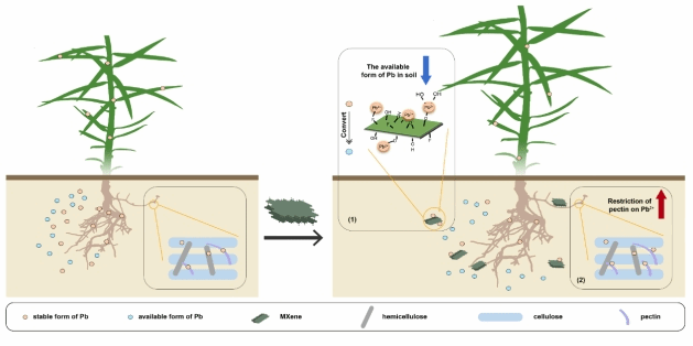 研究結果表明,在土壤中施加MXene后,可以有效抑制香榧體內鉛離子的積累,從而增強香榧幼苗對鉛脅迫的耐受性。該團隊的進一步研究,則揭示了MXene抑制香榧體內鉛離子積累的作用機制:一方面,土壤中MXene通過其吸附能力,將土壤中有效態鉛轉變成穩定態,從而減少香榧幼苗對土壤鉛的吸收;另一方面,MXene通過調控香榧根中果膠合成/代謝相關基因的表達來提高果膠含量,進而將更多的鉛離子固定在根細胞壁中,最終減少香榧體內鉛離子積累。