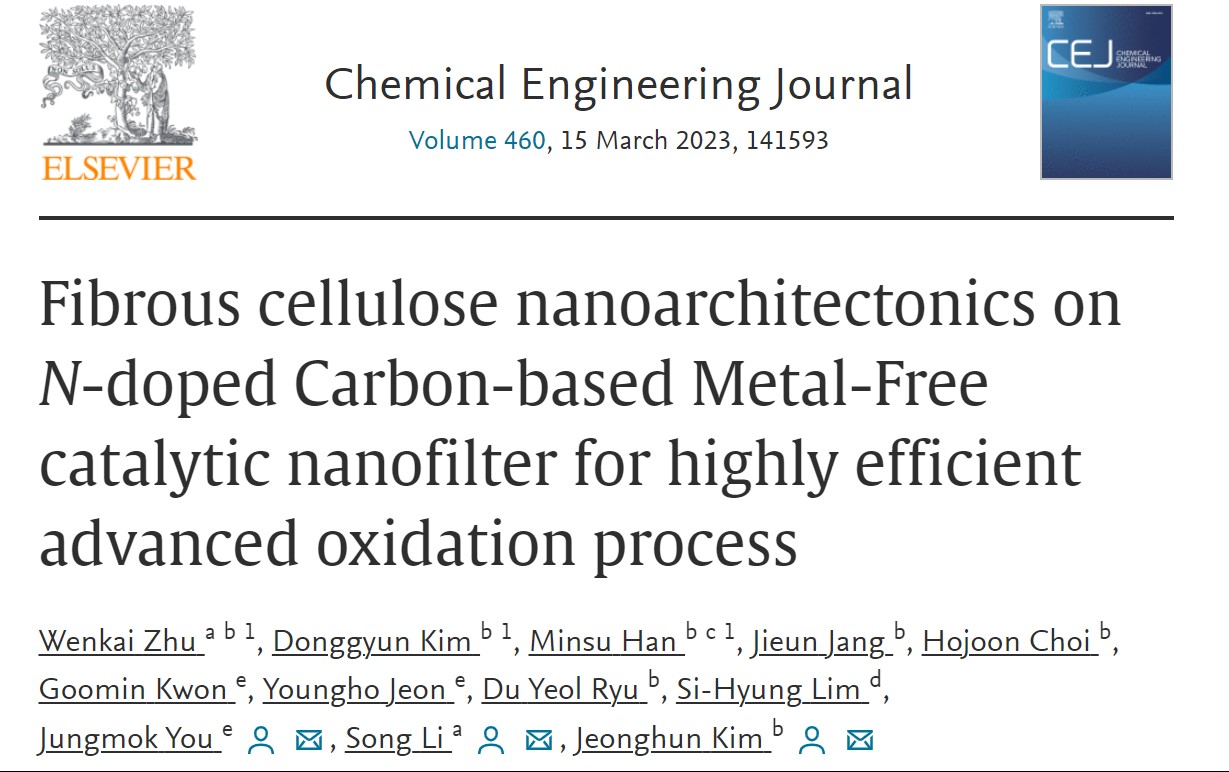 近日,林業工程學科綠色家居材料與創新設計團隊青年教師朱文凱以第一作者在工程技術領域國際期刊《Chemical Engineering Journal》上(中科院1區,IF=16.744)發表題為“Fibrous cellulose nanoarchitectonics on N-doped Carbon-based Metal-Free catalytic nanofilter for highly efficient advanced oxidation process”研究論文。通訊作者李松、韓國延世大學Jeonghun Kim教授及韓國慶熙大學Jungmok You教授。