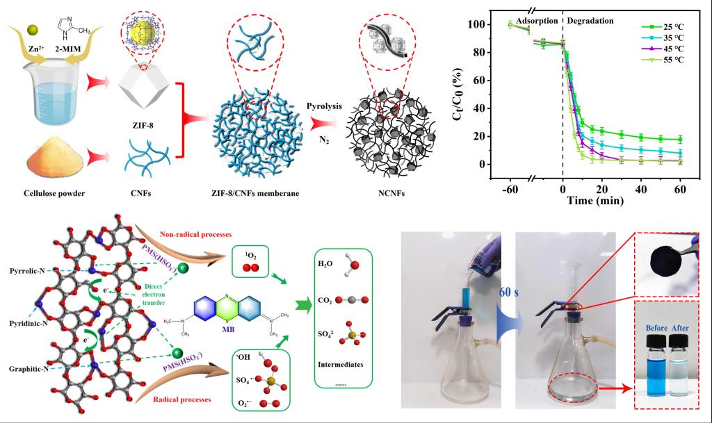 基于過硫酸鹽的高級氧化體系(SR-AOPs)是近年來降解各類污染物的研究熱點,其中氮摻雜碳材料在SR-AOPs中被認為是一種高效、環保的催化劑。基于此,本課題組率先報告了一種簡便的策略,使用纖維素納米纖維(CNF)和金屬有機骨架(MOF)作為SR-AOPs的無金屬催化劑前驅體,制備納米多孔氮摻雜碳納米過濾器(NCNF)。研究表明,NCNFs膜在降解有機污染物的過程中表現出優異的可重復使用性,可以在實際有機染料修復應用中作為催化過濾器。
