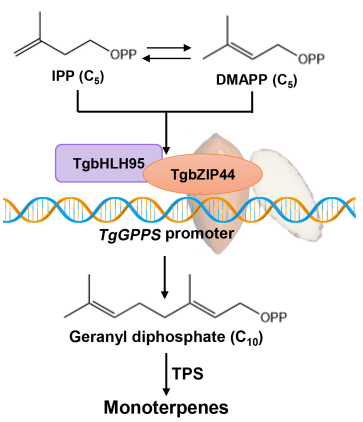 該研究利用共表達(dá)網(wǎng)絡(luò)分析并結(jié)合轉(zhuǎn)錄組分析鑒定到候選基因TgGPPS,該基因表達(dá)與香榧后熟過程萜類物質(zhì)含量呈顯著正相關(guān)。煙草葉片瞬時過表達(dá)和番茄果實(shí)過表達(dá)顯示,TgGPPS促進(jìn)萜類物質(zhì)的積累。轉(zhuǎn)錄組分析篩選到與TgGPPS協(xié)同表達(dá)的轉(zhuǎn)錄因子TgbHLH95和TgbZIP44。利用雙熒光素酶、酵母單雜交、EMSA試驗(yàn)表明TgbHLH95間接激活TgGPPS啟動子,TgbZIP44直接結(jié)合TgGPPS啟動子。此外,BiFC、LCI、Co-IP和GST pull-down分析顯示,TgbHLH95與TgbZIP44存在蛋白互作。研究結(jié)果豐富了香榧堅(jiān)果萜類合成的分子機(jī)制,也為其他堅(jiān)果呈香物質(zhì)的形成與調(diào)控提供借鑒作用。