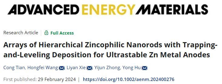 近日,化材學院胡勇教授等人在國際頂尖期刊《Advanced Energy Materials》(中科院1區Top,IF=27.8)在線發表題為《分層親鋅納米棒陣列通過先捕獲后填平沉積實現超穩定鋅負極》(Arrays of hierarchical zincophilic nanorods with trapping-and-leveling deposition for ultrastable Zn metal anodes)的研究論文,證明了由氮摻雜碳包覆Cu5Zn8合金構筑的核殼納米棒陣列(Cu5Zn8@NC)可以均勻負極界面離子通量并降低局部電流密度,實現超長的鍍鋅/剝離循環。