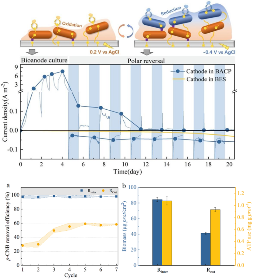 因此,該團隊開發了一種耦合PRB和BES的生物陰極-陽極耦聯系統(BACP),采用極性周期反轉(PPR)方法構建了由Geobacter和p-CNB降解細菌組成的共生陰極生物膜。