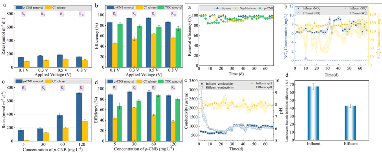 在外加電壓0.5V時,BACP的p-CNB去除效率超過94%,去除速率高達189.85 mmol m-2d-1,且BACP系統能夠耐受的p-CNB濃度超過120 mg L-1,以低功耗快速去除p-CNB,有效地滿足地下水修復需求。