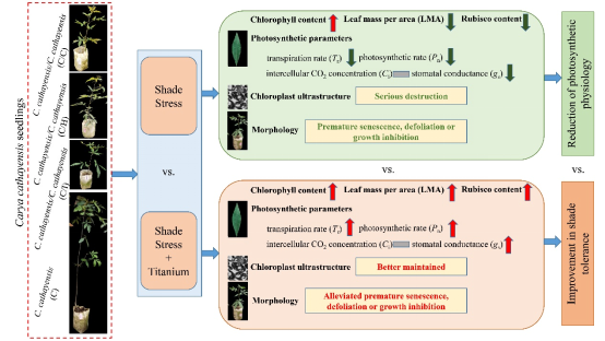近日,國(guó)家重點(diǎn)實(shí)驗(yàn)室林木栽培生理研究團(tuán)隊(duì)在國(guó)際知名期刊《Chemosphere》(IF=7.086)發(fā)表了題為“Application of titanium regulates the functional components of photosynthetic apparatus in grafted seedlings ofCarya cathayensis Sarg. under shade”的研究論文。該研究在光合作用層面解析了山核桃響應(yīng)遮蔭脅迫的生理機(jī)制以及抗水解穩(wěn)定離子鈦緩解脅迫的生理機(jī)制,為促進(jìn)山核桃在遮蔭條件下的生長(zhǎng)奠定了理論基礎(chǔ)。