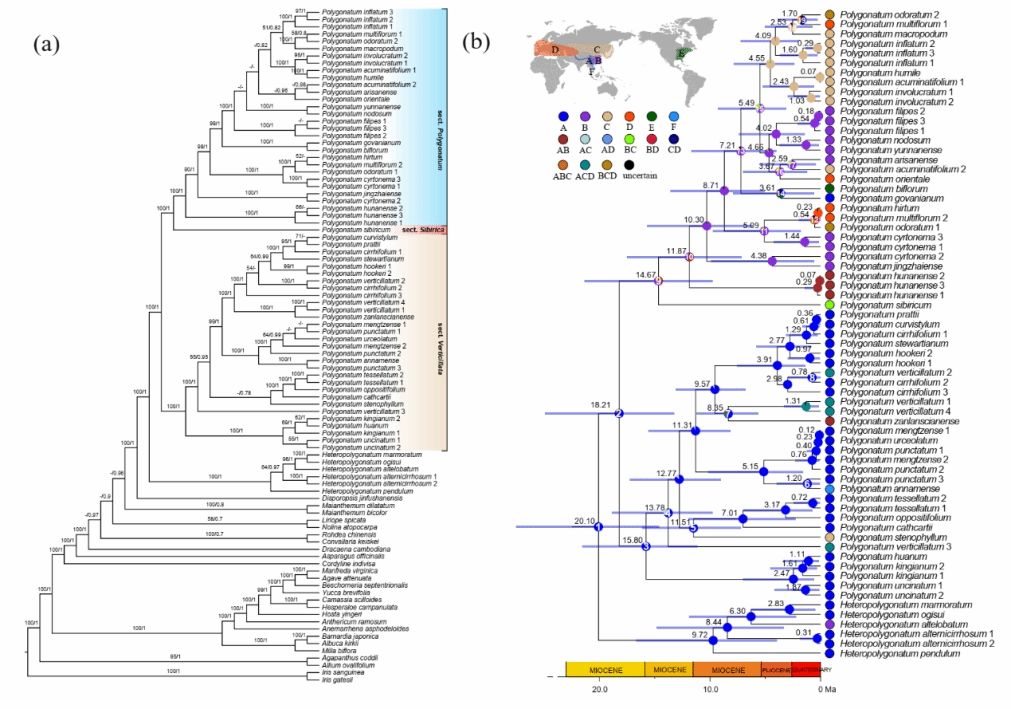 黃精屬(Polygonatum)隸屬于天門冬科(Asparagaceae)黃精族(Polygonateae),包含64個物種,其中,黃精、多花黃精、滇黃精等根莖不含淀粉,富含非淀粉多糖、低聚糖、皂苷、黃酮等營養和功效成分,具有重要藥用價值。該研究針對黃精屬的起源和演化過程不清,人工栽培種質混亂、分類系統不完善等基礎和應用問題,利用葉綠體基因組數據構建了黃精屬可靠的系統發育框架,重建了該屬的生物地理歷史,揭示了地質構造變化和環境因素在物種分化和性狀演化中的作用。