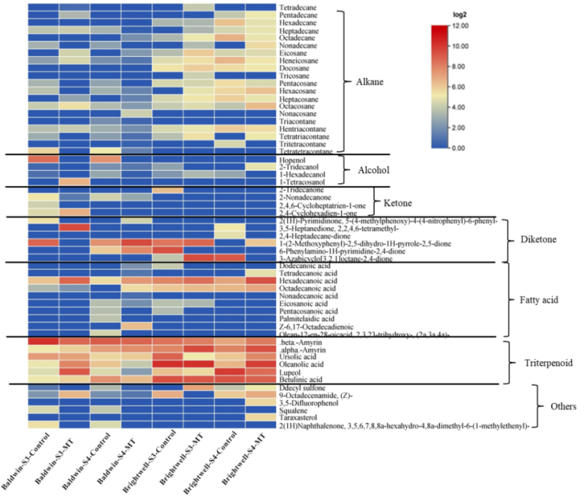 圖3兔眼藍莓果皮蠟質組分熱圖分析