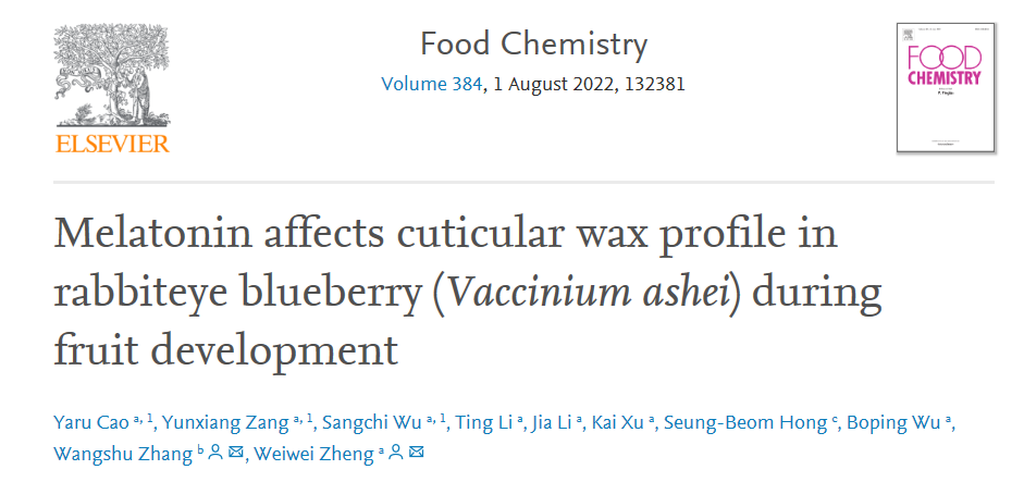 近日,園藝學院2019級碩士研究生曹亞茹和2019級園藝專業本科生吳桑池在果樹栽培生理與種質創新團隊鄭偉尉副教授的指導下,共同在國際知名期刊Food Chemistry(影響因子7.514/中科院一區Top)上發表了題為“Melatonin affects cuticular wax profile in rabbiteye blueberry (Vaccinium ashei) during fruit development”的研究論文。該研究為褪黑素調控兔眼藍莓果實發育過程中表皮蠟質代謝分子機理研究奠定了堅實基礎。