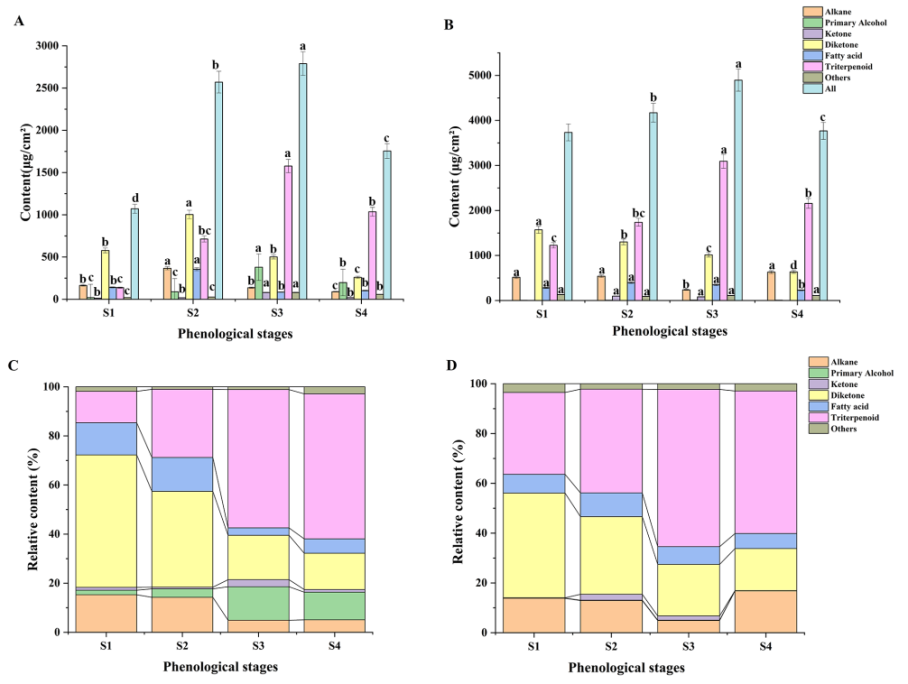 本研究共鑒定出56種蠟化合物。熱圖分析結果表明,各組分在不同果實發育階段含量存在差異(圖3)。并且,褪黑素對七大類蠟成分的含量有不同程度的影響。