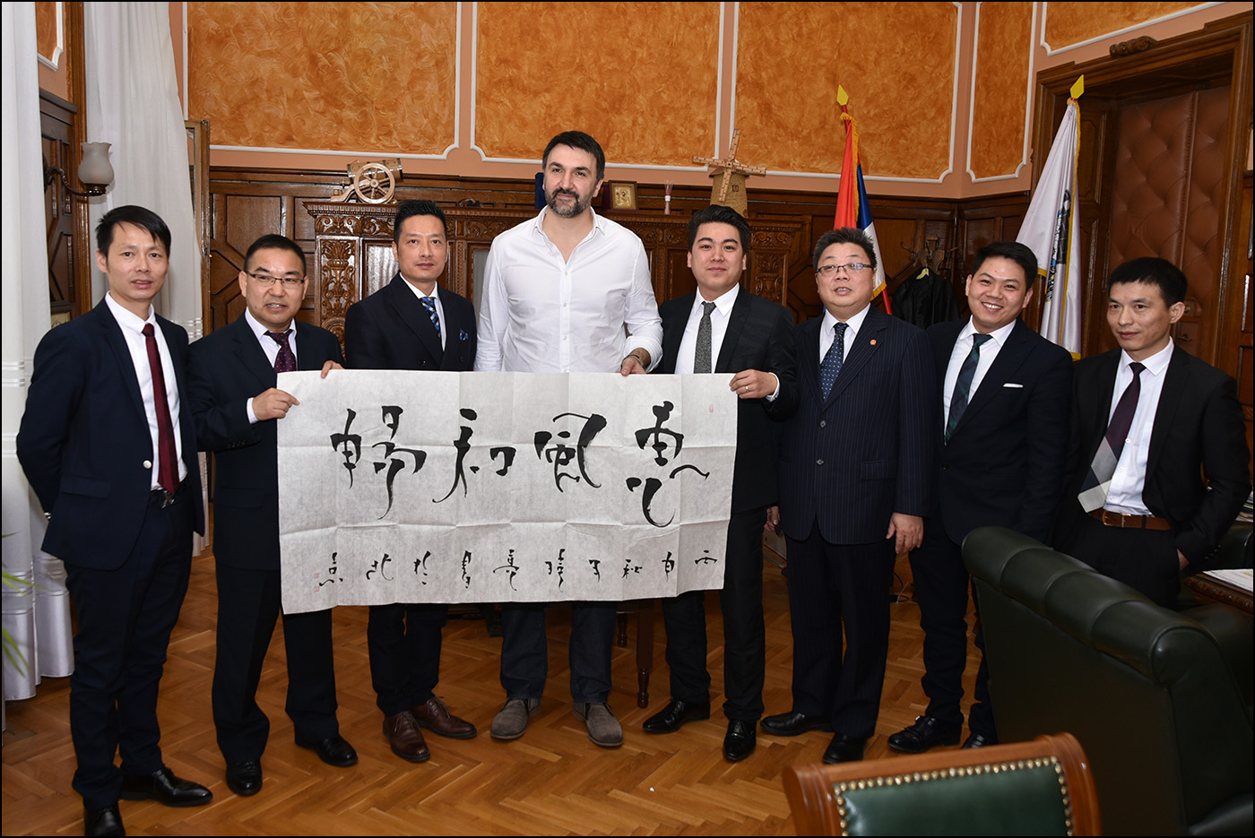 趙有華簡單介紹了孔子學院近三年來在漢語教學拓展、中國文化展示等方面的發展情況,并表示,塞爾維亞作為“一帶一路”沿線的重要國家,在中塞公民互免簽證的大好背景下,諾大孔院愿意為包括35所公立小學和9所公立高中在內的該市所有教育機構提供支持,為對漢語和中國文化感興趣的廣大中小學生提供教學師資。趙有華還向市政府和亞尼奇市長贈送了中國知名書畫家夏偉革的中國水墨作品《熊貓》和汪曉亮的書法作品《惠風和暢》。