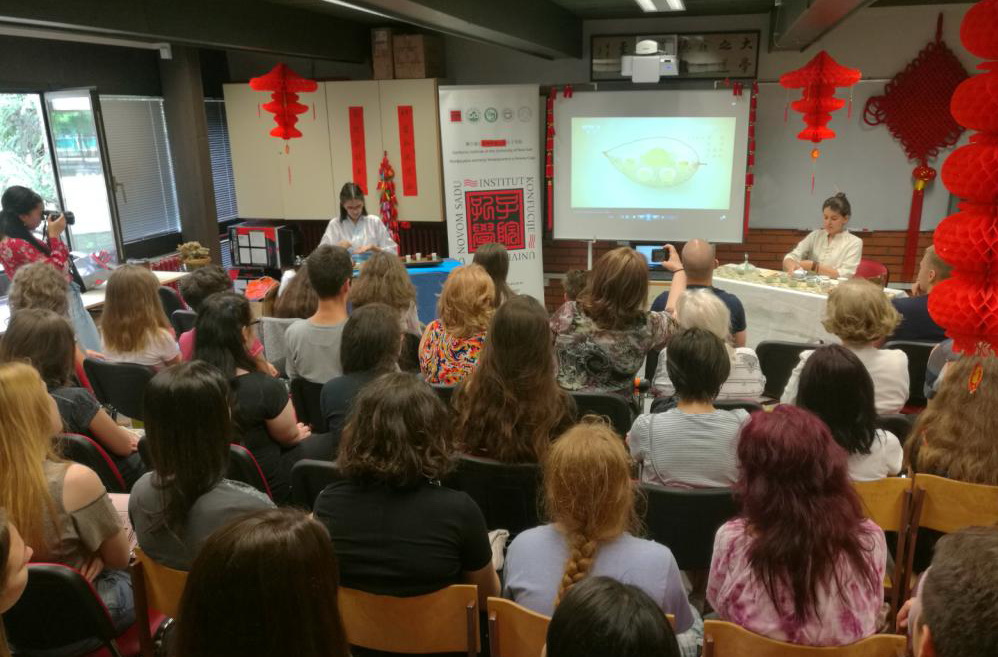 諾大孔院優秀學員妮娜(Nina Krsti?)、中國茶藝鐵桿粉絲吉吉(Srdjana Petrovic)分享了學習漢語和茶藝的心得,并表演了精湛優雅的茶藝。參加過孔院赴華夏令營的泰天(ALeksandar Vujic)和有過中國學習經歷的天樂(Igor Makaric)分享了各自在中國的見聞。泰天還和諾大孔院老師一起現場展示了書法、寫意中國畫和剪紙等。大家都被中國文化表演所吸引,紛紛用手機記錄下精彩的瞬間。